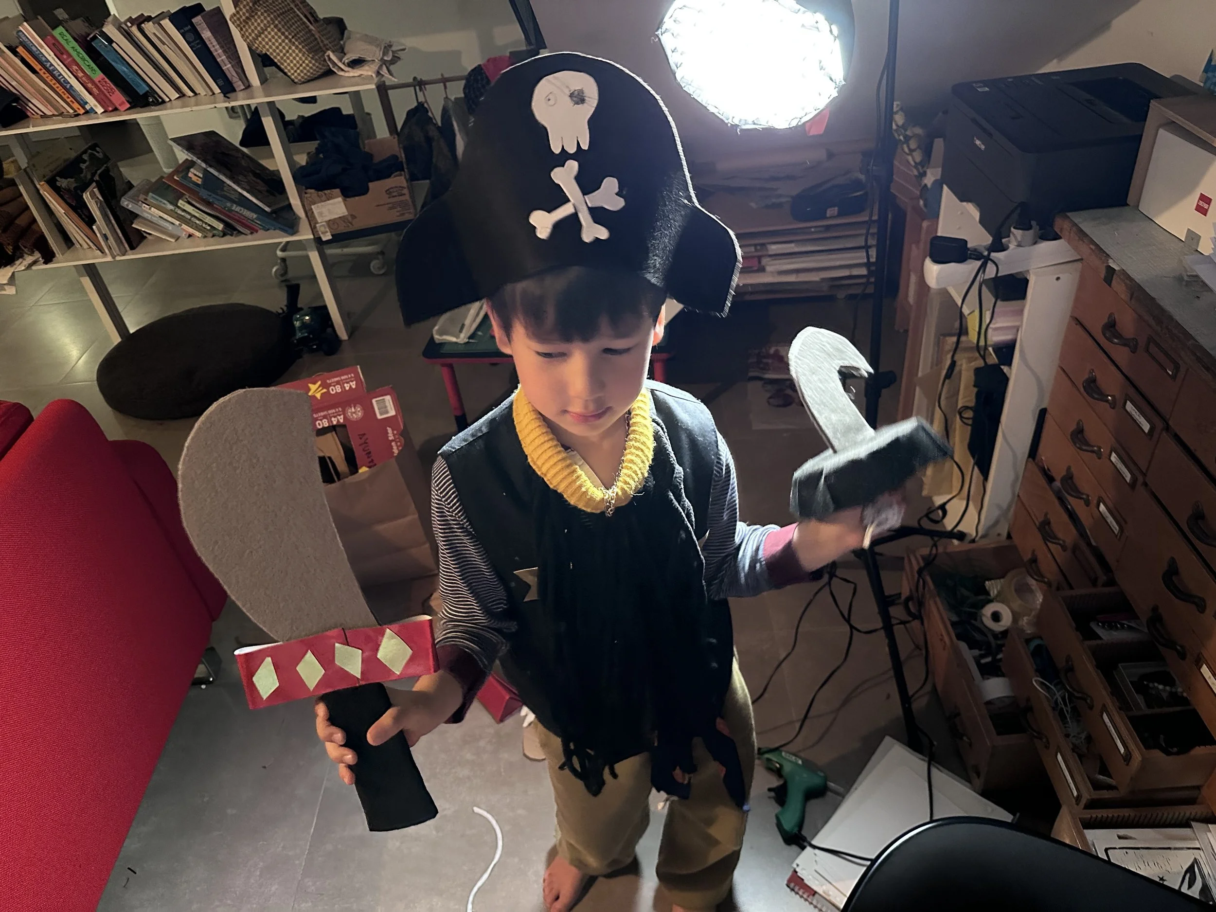 島上年度大事:嘉年華扮裝 本小鎮今年的官方主題是海盜,美勞大王我幫兒子自製了全套裝備